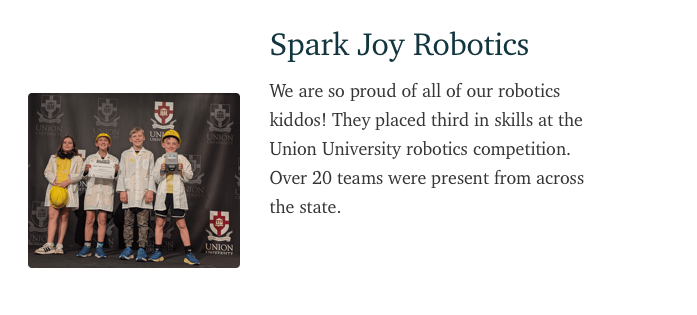 Spark Joy Homeschool Co-op March Newsletter Art Class: First Tuesday every month 1 @ Cypress Grove Nature Park Art is is open to the public and will occur once a month on a Tuesday. Register for all art classes here: https://signup.com/go/zgDDmFU $5/student for Spark Joy Members. $10 per student/general public Hideaway in History Class: No history classes this month due to Spring Break Field Trips: Adventure Science Center in Nashville: Rescheduled from Feb for March 16 @ 10:30 AM those...