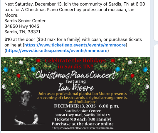 Local Libraries Jackson Madison County Library Events Program Guide: https://jmclibrary.org/program-guide Craft a Gift Dec 6 @2pm Art Dec 5 & 12 (all ages) @ 3:30PM Santa at the library Tues Dec 16 @5PM Noon Years Eve Dec 31 @ 10:30AM-1PM Board Games Jan 2 @ 10:30 AM Coding Club Dec 11 @3:30 PM Teen Advisory board Dec 3 @4pm Brown Bag Homeschool Wednesdays @ 12: 30 Crafts Dec 8 @ 2: 30 Holiday Party: Light refreshments Sat Dec 13 @ 11-1 Cookie Decorating Dec 22 @4pm Warewolf Game Day Dec 27 11AM-3 Tween/Teen Movie Dec 30 1-3PM Starbucks Book Club Dec 30 @6PM : 2034 N. Highland Lexington Library events: https://www.ehlibrary.com/kids--teens.html Everett Horn Library Events Library temporarily closed for renovation Gibson Library events https://www.facebook.com/gcmlibrary/ The Jackson The Jackson Symphony in Jackson, TN