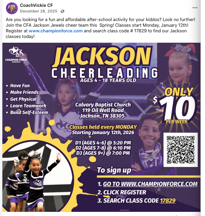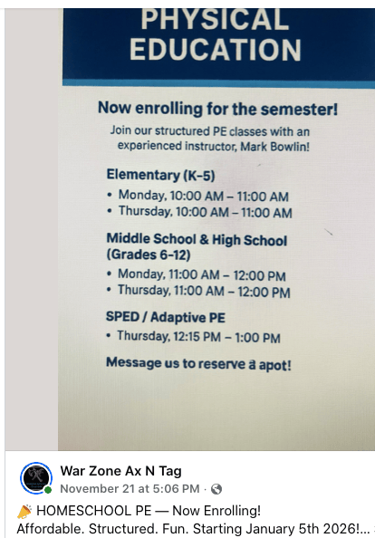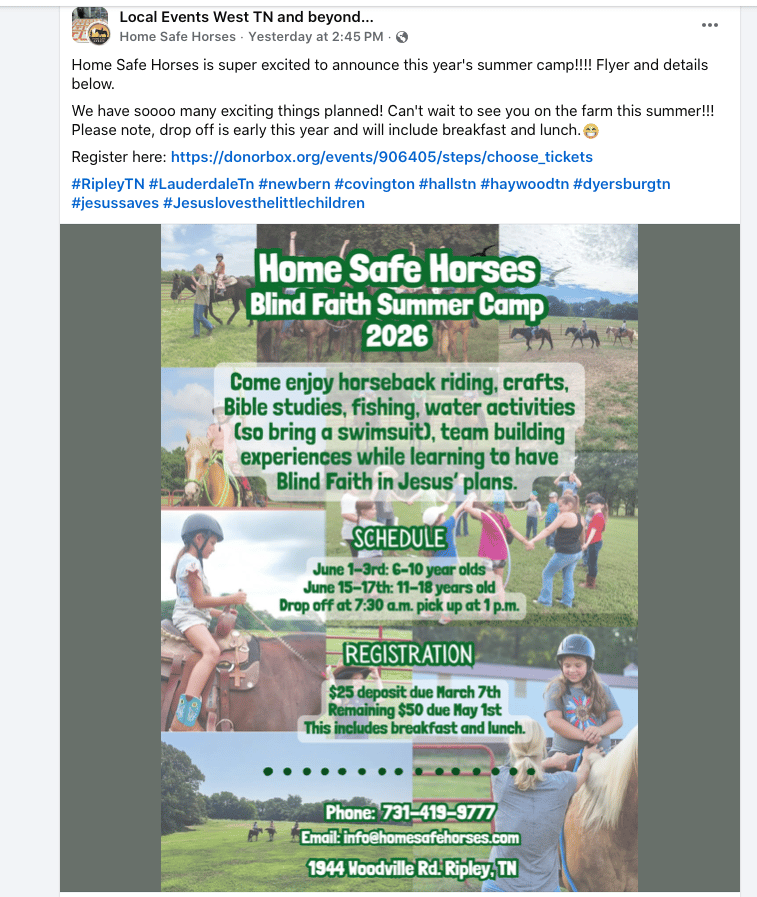 Delivery on Sat Feb 14 available for additional $3 fee Art Class: I am hoping to reschedule art for Feb 24 @ Cypress Grove Nature Park Art is is open to the public and will occur once a month on a Tuesday. Register for all art classes here: https://signup.com/go/zgDDmFU $5/student for Spark Joy Members. $10 per student/general public Hideaway in History Class: Spark Joy and Ridgecrest members will continue to hold indoor history classes once a month. The indoor classes are not open to the public. Tues Feb 17 12:30pm Monthly Public history class : Outdoor public history classes are cancelled until further notice. Tues Feb 20 @ 12:30 PM Class at Ridgecrest: Open to Spark Joy and Ridgecrest students only Field Trips: Union University Physics Department : Feb 13 @ Noon-1PM Middle and High school students ONLY. Spark Joy and Ridgecrest students will get an opportunity to learn interesting topics and see demonstrations that show off physics as a discipline. This trip IS NOT open to the public. Ms. Patricia and Ms. Alexis are willing to provide transportation to older students attending this trip while younger students remain at co-op. JEA Tour : Feb 20 (Free Admission) We will tour the JEA bunker. This trip is open to Spark Joy members ONLY. This trip is not open to the public. Jackson Recycling Center: Feb 27 @ 9:30AM SHARP! (Free Admission) We will tour the Jackson Recycling Center. This trip is open to Spark Joy and Ridgecrest members ONLY. This trip is not open to the public. Parents MUST be on time! Adventure Science Center in Nashville: Rescheduled for March 16 @ 10:30 AM due to snow in January. I have a ticket for ONE adult and ONE child due to a family being unable to attend the new date. I could not get a refund for the individual tickets purchased. I would love to find someone willing to grab them up. $20 for the pair. West TN Department of Ag. museum: Ledbetter Rd Milan: Friday March 20 @ 10:30AM (Free Admission) We will tour the Jackson Recycling Center. This trip is open to Spark Joy and Ridgecrest members ONLY. This trip is not open to the public. Parents MUST be on time! Music Class: North Park Studio of the Arts Last Wednesday of every month at noon. $10/child paid directly to the studio https://signup.com/go/mhScKzp Science Class: Feb 6 & 13: Science classes are held at Beech Bluff Rec Center. which is located in the former Elem. School 10AM - 2PM Feb 6 topic: Air pressure, Gyroscopes, Balance, and Gravity We will explore and play with various toys to learn physics principles. This will be a fun and educational opportunity to explore physics. Feb 6 topic: Flight (Rockets, helicopters, drones) We will explore and play with various toys to learn physics principles related to flight. This will be a fun and educational opportunity to explore physics. Students will have an opportunity to fly a drone and a mini helicopter. Non-Member science class registration https://www.signupgenius.com/go/60B0A4FAAAB2FA1F94-47228472-science?useFullSite=true $20 drop in fee per family per session (we do not charge per child)y Free Forest School Announcements: FFS is an all season program. However, we do cancel if serious adverse weather conditions are present such as ice, hail, freezing rain, extreme cold etc. Please be sure to watch the group chat for weather related announcements. If the weather is good enough for hiking we will go out! We do often modify winter lessons. Until further notice book/snack/craft are not occurring. We are only nature walking. If we have a reasonably nice day, we may do some knot tying this month. Draw Write Now: April 13 @ 1:15 PMDraw Write Now Art+Li+history : Ridgecrest Academy (Theresa) This program is open to current Spark Joy science class members only. Art class: is open to the public and will occur twice a month on a Tuesday and a Wednesday. visit: https://signup.com/go/zgDDmFU Chess club: Last Saturday of every month at Jackson Main Library just after Pokemon trading time Book Club: Meets 11:30 AM at Jackson main library 433 E. Lafayette st. one Wednesday a month. Please check our calendar as dates are dependent on library program room availability. We have open slots for up to two more families. If interested reach out to SparkJoyHSC@gmail.com Volunteers needed: RIFA Canned Good Delivery Throughout the winter months Rifa will deliver canned goods one Monday every other month to senior citizens in need. Any family interested in volunteering for this mission can register on our sign up roster. The roster will be updated each month when Rifa schedules the drop off. Please check back regularly. https://www.signupgenius.com/go/60B0A4FAAAB2FA1F94-47152762-volunteer MD Anderson Planetarium Free shows every Friday and Saturday when the University at Lambuth is open. Home Depot and Lowes Building Kids clubs every month. Home Depot is the first Sat. every month 10AM-Noon Lowes Varies check website for details Homeschool Roster Field Trips https://www.homeschoolroster.com/ February 4 & 5 Taming of the Shrew Feb 11: Jazz Festival February 18: Sound of Music March 2: Sound Waves indoor waterpark Opreyland March 6: Birds of Prey March 20 & April 3: 11AM -12:30PM March 27 Peter Pan March 27, 2026 @ 10:00 am - 11:30 am Madison County Parks and Rec.Lexington Parks and Rec: Softball Signups are open www.lexingtontnlittleleague.com Local Libraries Madison County Library: https://jmclibrary.org/program-guide Lexington Library events: https://www.ehlibrary.com/kids--teens.html Everett Horn Library Events Library temporarily closed for renovation Gibson Library events https://www.facebook.com/gcmlibrary/ The Jackson The Jackson Symphony in Jackson, T I Exotic Pet Expo SAT, FEB 21 - FEB 22Jackson, TN Reptile & Exotic Pet Expo Feb 21 & 22, 2026 Henderson Elite: Give your kids confidence, give them motivation, give them strength to stand up for themselves! We offer all of that right here! We have seen kids come in so shy and scared and grow into brave and confidence people! Kids des